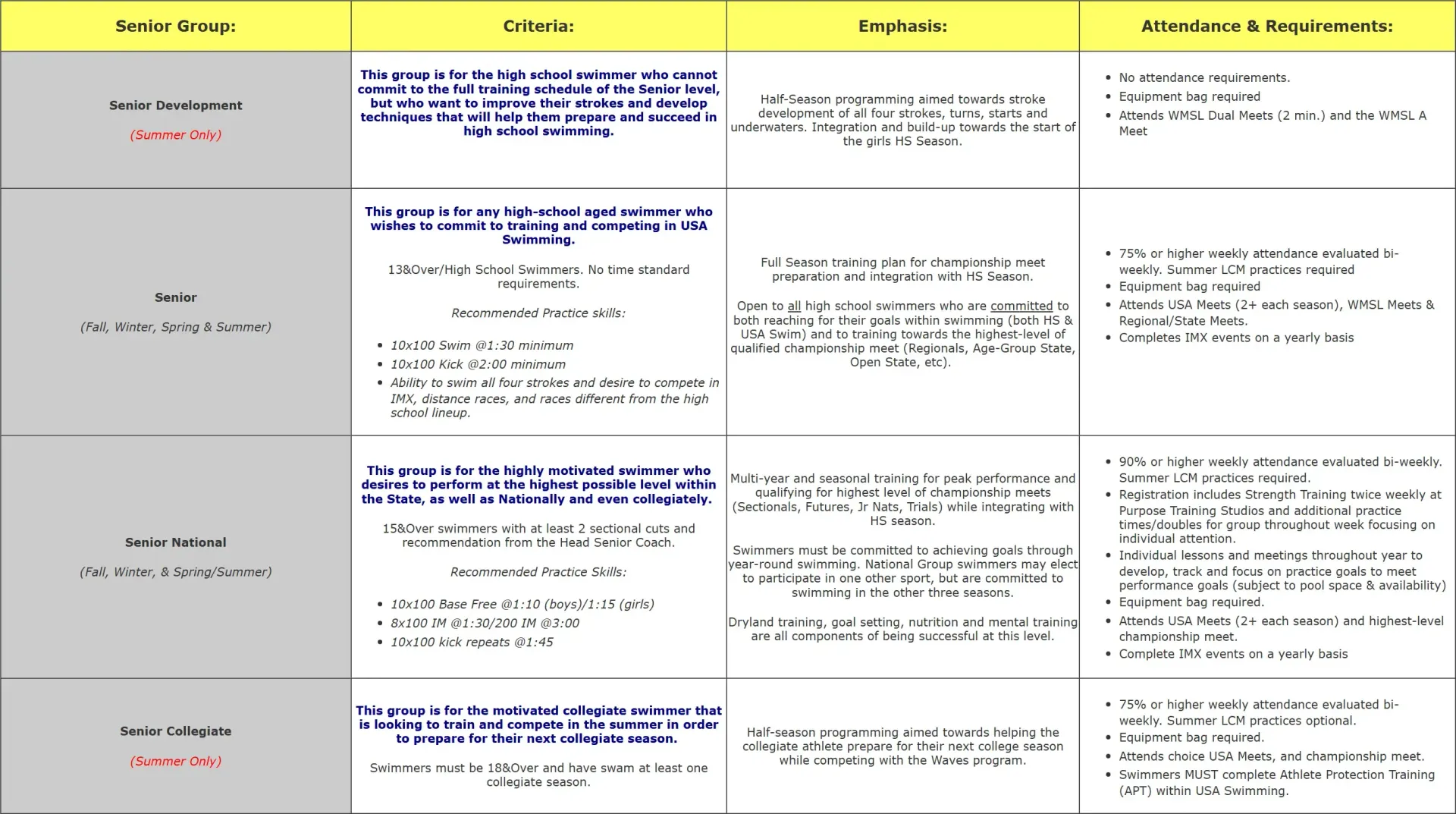 To achieve the above goals, Senior is divided into four groups: Senior Development (Summer Only), Senior, Senior National and Senior Collegiate (Summer Only). Entrance into these groups is based on criteria and goals of each swimmer.